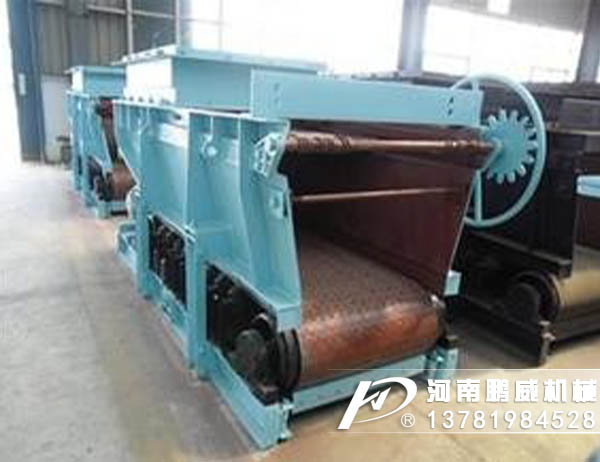 料倉內(nèi)的物料經(jīng)連接段進(jìn)入導(dǎo)料槽落在甲帶上,甲帶靜止時(shí)物料最終靠內(nèi)摩擦力而停止運(yùn)動(dòng),在出料口形成一定的角度的靜止角度堆積;當(dāng)驅(qū)動(dòng)滾筒在外力的驅(qū)動(dòng)下開始旋轉(zhuǎn)時(shí),帶動(dòng)膠帶運(yùn)動(dòng),膠帶帶動(dòng)其上的甲帶運(yùn)動(dòng),甲帶帶動(dòng)其上的物料導(dǎo)向出料口,運(yùn)行中的甲帶在出料口卸載后轉(zhuǎn)向回程,物料不斷從出料口排出,完成給料過程;二次密封裝置對從導(dǎo)料槽和膠帶之間間隙中漏出的物料提供密封;改變給料量,可通過調(diào)節(jié)轉(zhuǎn)臂行星摩擦式無極變速機(jī)的調(diào)速手輪來改變輸出軸轉(zhuǎn)速,改變甲帶運(yùn)行速度的大小,從而改變給料量;改變給料量,也可通過選配變頻器,改變電動(dòng)機(jī)轉(zhuǎn)速,從而改變給料量。