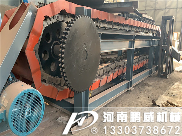 鏈板機結構設計合理,使用性能好,運行阻力小,易損零件少,操作安全,維修方便,運行可靠,使用壽命長。鏈板機可水平或傾角<30°安裝,傾斜安裝時,配有棘輪逆止機構。輸送鏈板上的輥輪在導軌上滾動,輸送鏈與機殼無磨擦;鏈條采用合金鋼熱處理加工制成,其正常使用壽命3年左右,運行中故障率低。除頭尾軸承外,輸送機中無潤滑點。鏈板機由頭部機架、頭部護罩、主動鏈輪組、輸料裝置、中部機架、尾部機架、改向鏈輪組,鏈板托輪組和驅動裝置組成。驅動裝置由柱銷聯軸器、JZQ減速機、驅動底座組成。分右裝和左裝兩種,從機尾向輸送方向看,驅動裝置在右側為右裝,在左側為左裝。鏈輪采用組裝式結構,由鑄鋼鏈輪圈與鏈輪芯用螺栓聯結組合,耐磨性能強,便于拆卸安裝。主動鏈輪采用窩眼鏈輪圈,防止環鏈運行中滑動。
